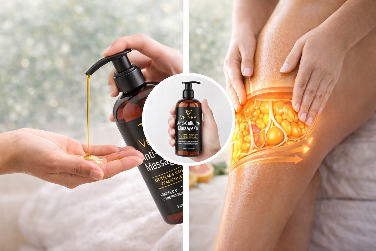 Velyra Anti-Cellulite Massage Oil is designed to support the appearance of smoother, more nourished skin when used with consistent massage.